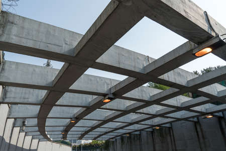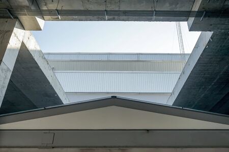 Concrete structure viaduct of the industrial area of the city during the day against a blue sky with clouds