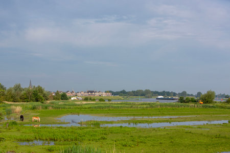 black and brown horses graze near ameide on the shore of river lek in the netherlands