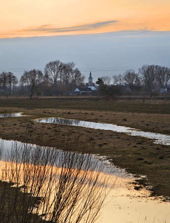 Young cereal growing on flooded field in Poland. Natural early spring landscape.