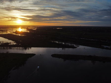 Aerial from a cargo ship on the river Merwede near castle Loevestein in the Netherlands at sunset