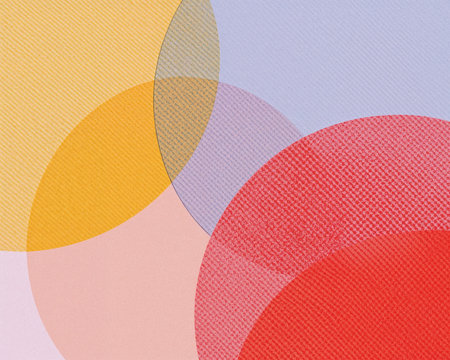 Abstract artwork featuring overlapping circles in vibrant red, yellow, pink, and purple hues. Textured patterns add depth and visual interest to the geometric design.