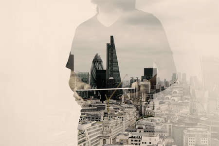 Double exposure of man with urban cityscape highlighting modern city life.