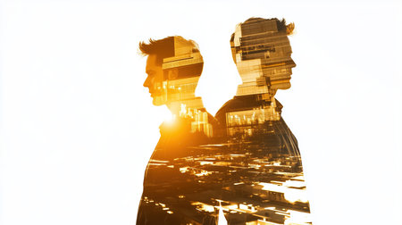 Double exposure of business people in an office setting with a cityscape silhouette background, creating a blurred effect. This concept represents professional teamwork or a corporate conference. The photo was taken with an EOS R5 camera at an aperture of f/2.0. --ar 3:2 --v 6.1 Job ID: 39420d32-e235-4881-a528-ae6f2ae4b91a