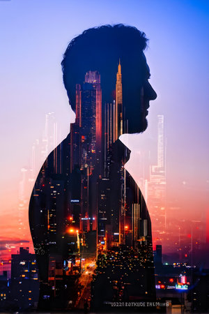 A double exposure where a mans face is merged with a cityscape backdrop. The mans features blend seamlessly with the skyscrapers, creating a captivating visual effect.