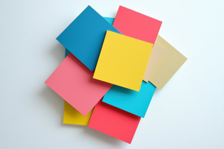 Discover a vibrant collection of blank sticky notes in various colors arranged artistically on a surface, perfect for creative planning and organization.