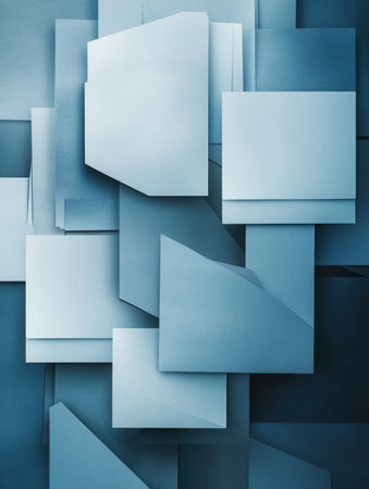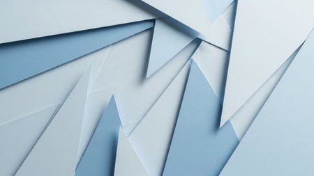 This abstract a composition of overlapping geometric paper shapes. The shapes are primarily triangles and angular forms, creating a sense of depth and dimension through their layering. The color palette consists of soft blues and whites, with subtle gradients and shadows that enhance the clean, modern aesthetic. The overall impression is one of minimalist elegance and a variety of creative applications.