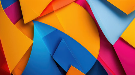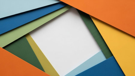 A visually striking abstract composition featuring overlapping layers of colored paper. The arrangement creates a sense of depth and dimension with vibrant hues of orange, deep blue, forest green, bright yellow, and a central white space. The clean lines and geometric shapes suggest a modern and organized creative projects or as a dynamic backdrop. The interplay of colors and forms offers ample opportunity for and visual applications.