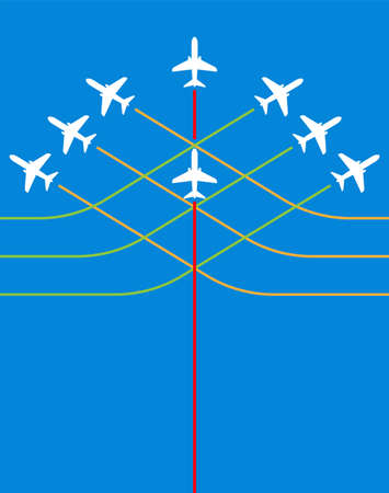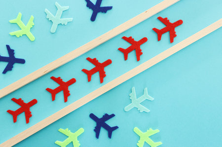 top view of a group of passenger planes on a blue background. Passenger transportation. The airline. International and commercial flights.
