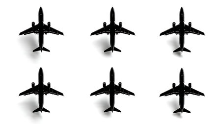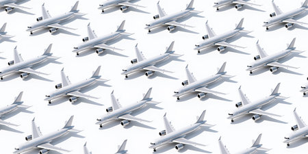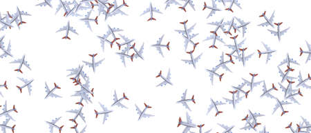 A repeating pattern of white passenger airplanes with two engines on wings, shown from side, with shadows, in illustration style, on a white background.