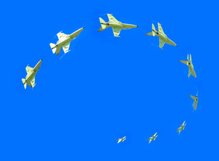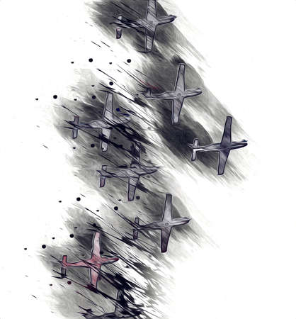 A group of airplanes flies in the sky in a scattered formation. The aircraft are moving in various directions, creating a dynamic scene against the blue sky.
