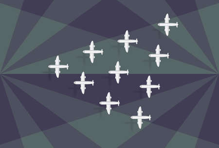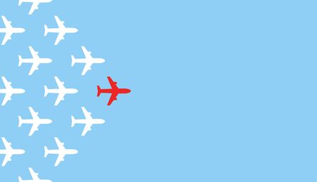 Leadership concept. One red leader airplane leads other white airplanes forward. Red and white airplanes. Motivation business vector illustration.