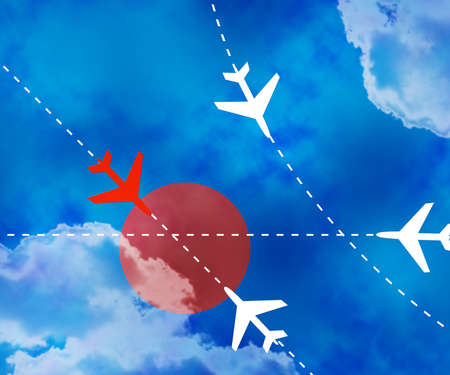 Think differently. A red plane changing direction from the white planes. Different, courage, unique, leadership, change, creative, new path, be yourself business concept. Vector illustration.