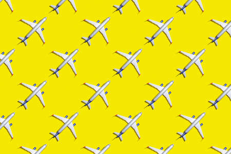 Travel and vacation concept. Top view of plane on bright yellow color background pattern. Mockup for travel project