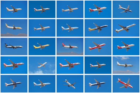 TENERIFE, SPAIN - CIRCA 2016: Set of different airplanes, from different airlines such as Ryanair, Iberia, British Airways, Jet 2 , Tuy, taking off or landing in Tenerife airport, Spain.