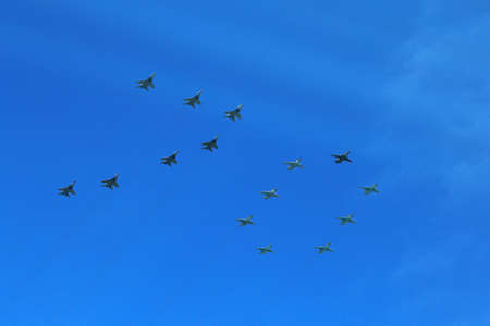 70 shaped formation of a group of fifteen russian military fighter jet planes flying high in blue sky during Vicotry Day parade air show on 9 May in Moscow, Russia