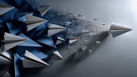 A bunch of paper airplanes flying in the air. The airplanes are scattered in different directions and sizes. Concept of freedom and movement, as if the airplanes are soaring through the sky