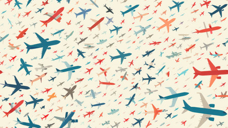 Bright and different aircraft for promo banner, abstract symbolic poster with airplanes for business and promotion. Different vector flat design seamless background pattern.