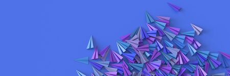 Pattern from white paper airplanes on a blue background. Creative concept of travel, flights.