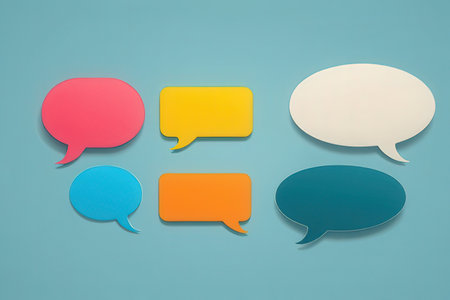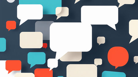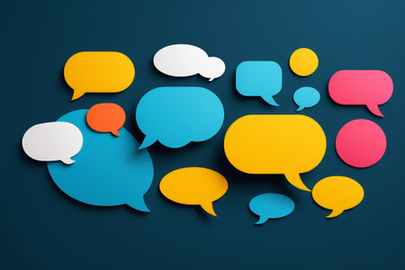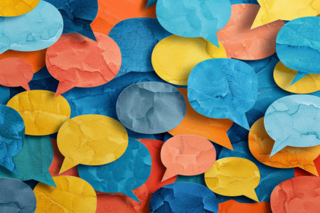 A vibrant collection of speech bubble icons in various colors and dot patterns, artfully arranged on a textured dark surface, symbolizing communication.