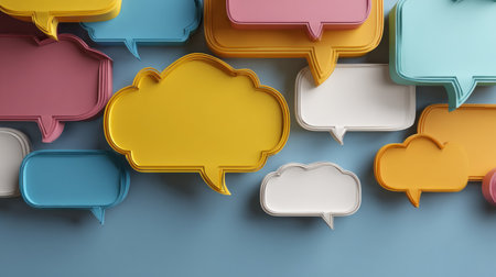 This image showcases an arrangement of colorful, three-dimensional speech bubbles against a blue backdrop. The bubbles exhibit a variety of colors and sizes. They are captured with overhead lighting, creating shadows that emphasize the dimensional forms. Suitable for illustrating ideas related to discussions, communication, and information sharing, adaptable for both commercial and editorial contexts.