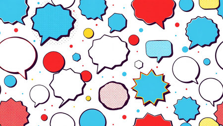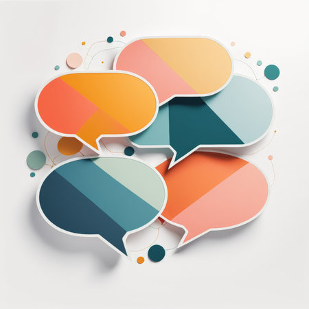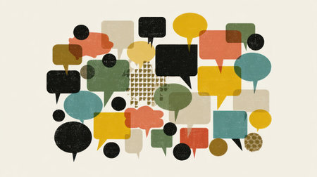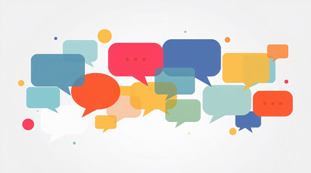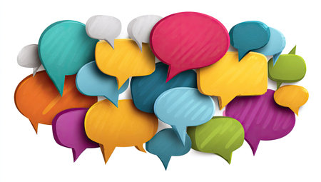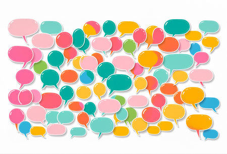 A dynamic arrangement of colorful speech bubbles and circular shapes showcases a mixture of hues, reflecting the energy and diversity of conversation and expression.