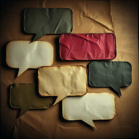 Colorful chat bubble icons representing conversations and ideas, artfully arranged on a dark, textured background.
