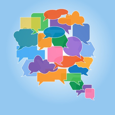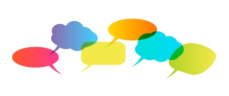 A white background features a vibrant collection of speech bubbles in shades of blue, red, and green.