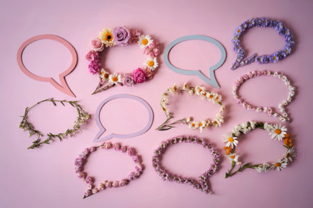 Various pastel-colored speech bubbles are decorated with different types of flowers on a pink background. The image evokes a feeling of communication and springtime.
