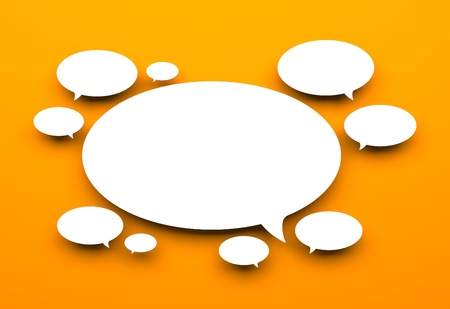 A collection of white and yellow speech bubbles in various sizes and shapes arranged against a brown background