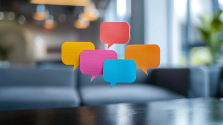 Five vibrant, multicolored speech bubbles conveying messages and conversation, set against a soft-focus background of a contemporary workspace.