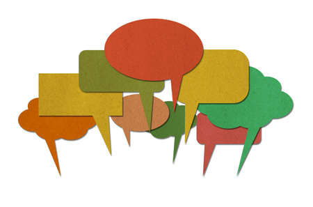 A colorful collage of paper cutouts of speech bubbles. The speech bubbles are of various sizes and colors, and they are arranged in a way that creates a sense of movement and energy