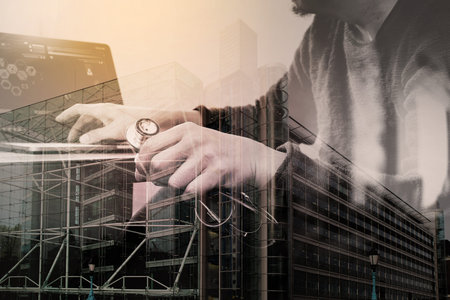 Creative double exposure image of a young man standing overlay with cityscape image. The concept of modern life, business, city life and internet of things