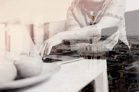 double exposure of designer man hand using laptop compter and mobile payments online shopping,omni channel,sitting on sofa in living room,green apples in wooden tray,London city buildings