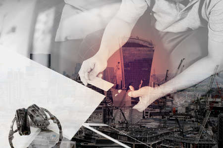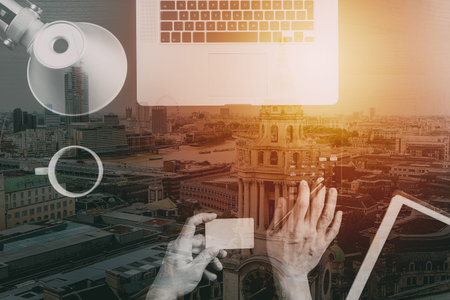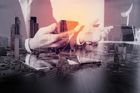 Double exposure of Photo website graphic designer hand meeting team with new project modern studio.Modern laptop digital tablet smart phone with London architecture,building