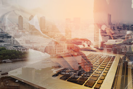 Double exposure of Business team meeting present. professional investor working new startup project. Digital tablet keyboard docking screen computer with London architecture,building