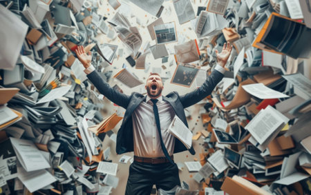 Businessman screaming surrounded by flying papers chaos concept