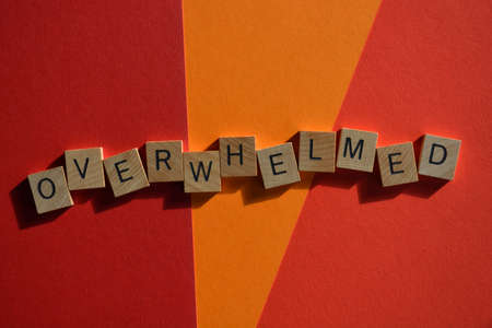 Overwhelmed, word in wooden alphabet letters isolated on orange and red background with copy space