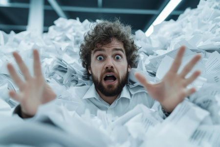 Screaming businessman drowning under a lot of paperwork in the office, he is overwhelmed by work and going insane