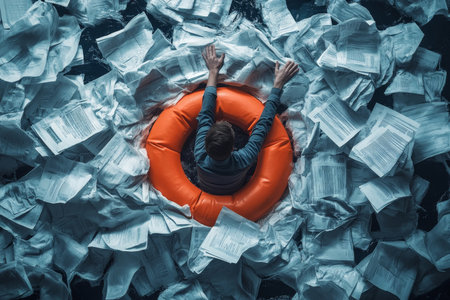 A person drowning in paperwork reaches for a lifebuoy, symbolizing bureaucratic struggle.