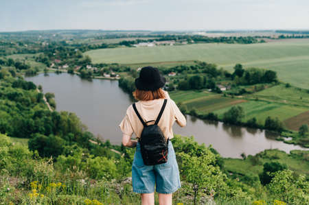 The back of a hipster girl stands with a backpack on the background of the lake and the village and looks at the beautiful landscape. Female tourist is engaged in domestic tourism.