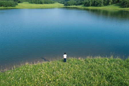 Rear view of young male traveler in shirt and shorts standing on riverbank close to water and enjoying nature and solitude on summer day