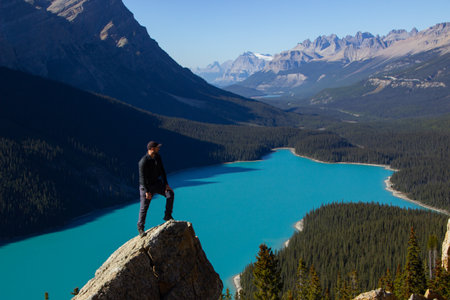 Hiking man on top of a rock admiring the great Peyto Lake with its turquoise waters, on a sunny day.