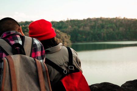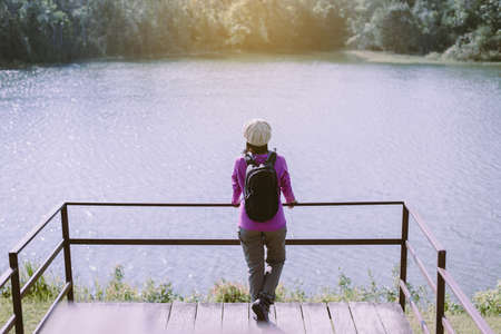 Happy backpacking woman standing and looking beautiful view at outdoor