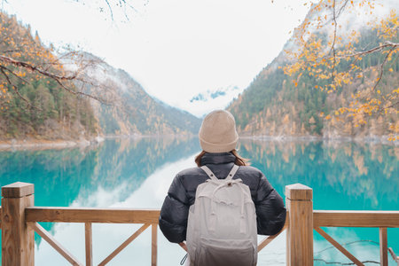 Happy woman traveler travel in jiuzhaigou national park in Sichuan, China. Tourist sightseeing Long lake and snow mountain in Autumn season. Famous Landmark and Vacation near Chengdu, China