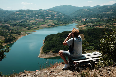 Woman sitting above Rovni Lake in Serbia, admiring the panoramic mountain scenery. Side view. Travel in Serbia concept