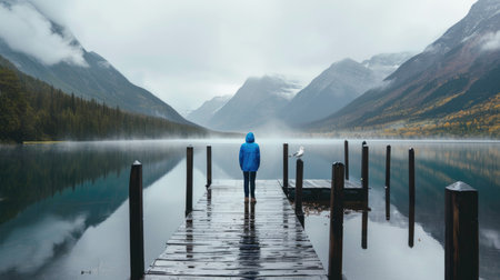 A person stands on a wooden pier, gazing at the serene lake enveloped in mist. Lush green trees and mountains create a picturesque backdrop during a tranquil morning.