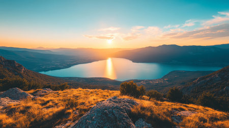 Beautiful sunset in the mountains. Landscape with mountains and lake