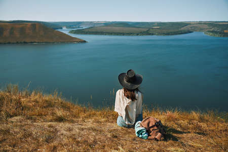 Hiker girl. Trip alone. Young woman travel with adventure. She sitting on nature and looks to quarry.