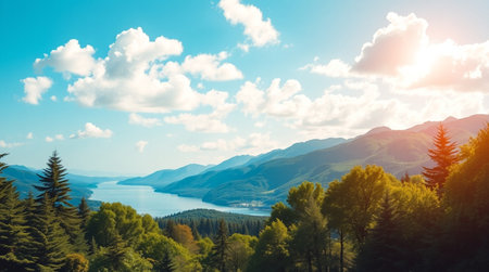 A tranquil lake reflecting the sky is nestled amidst towering mountains and rich foliage. Sunlight spills across the landscape, highlighting the natural beauty of the area.