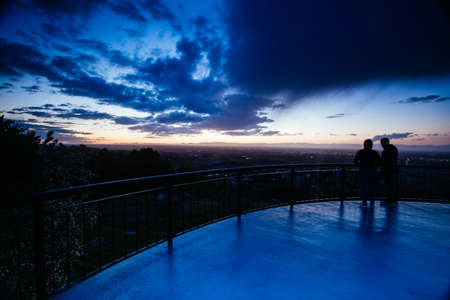 Frankfurt / Germany - August 03 2018: Tourists enjoying the sunset above the skyline of the city
